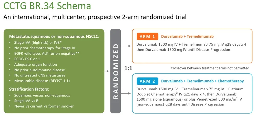 Natasha B. Leighl, et al. CCTG BR.34: A randomized trial of durvalumab and tremelimumab +/-platinum-based chemotherapy in patients with metastatic (Stage IV) squamous or nonsquamous non-small cell lung cancer (NSCLC). Presented at: 2020 ASCO Virtual Scientific Program; May 29, 2020. Abstract 9502.