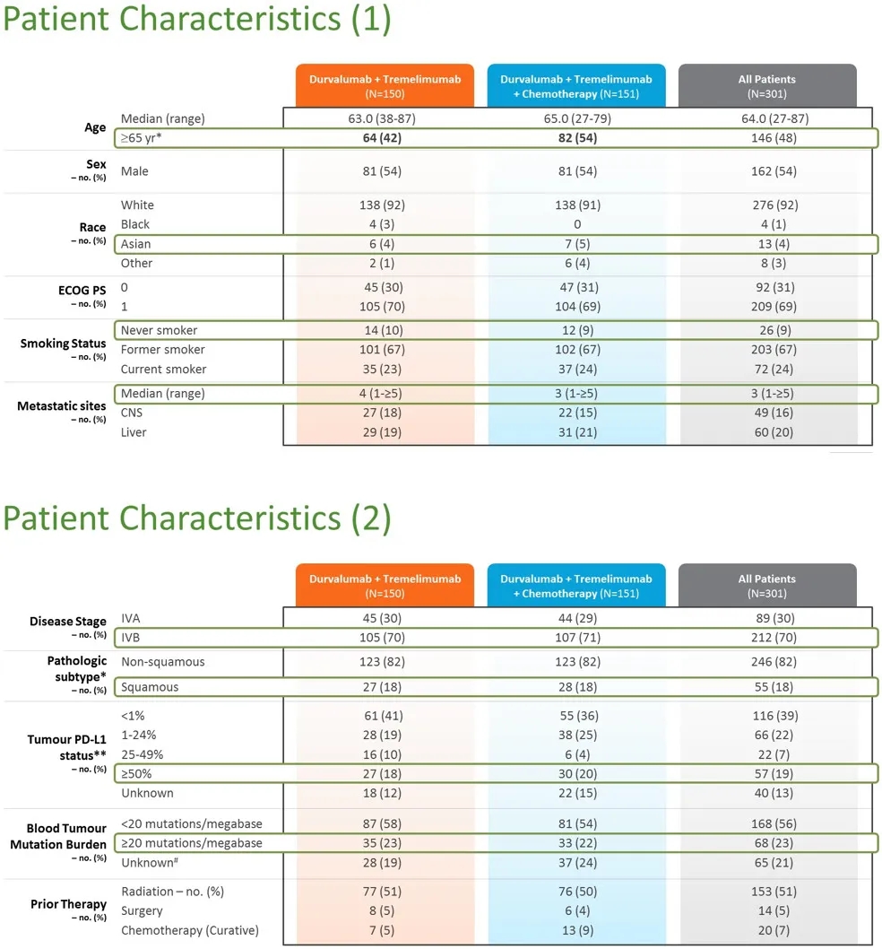 方法:301名患者被随机分配至durvalumab(1500 mg)+ tremelimumab(75 mg)及durvalumab(1500 mg)+ tremelimumab(75 mg)+CT(含铂双药化疗),之后分别接受durvalumab 1500mg维持及D +培美曲塞(非鳞状)维持治疗直至疾病进展。主要研究终点是总生存期(OS),次要研究终点包括无进展生存期(PFS),客观缓解率(ORR)和不良事件。
