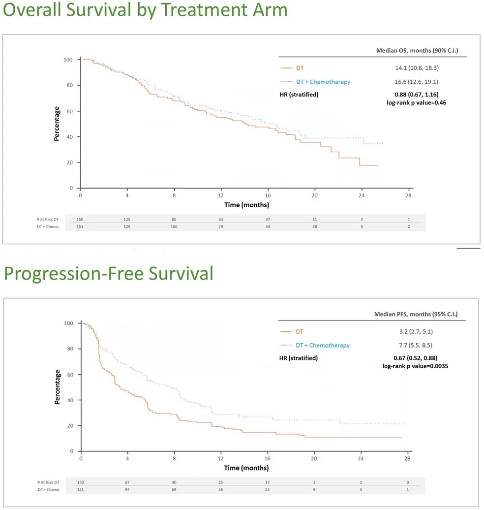 结果:中位随访时间16.6个月,DT+CT组对比DT组OS没有统计学差异(16.6月 vs. 14.1月,HR=0.88,p=0.46)。DT+CT组的中位PFS显著延长(7.7 月vs. 3.2月,p=0.0035, HR=0.67)。DT+CT组基于iRECIST 标准评估的ORR高于DT组(27.7% vs. 14.1%, p=0.001)。