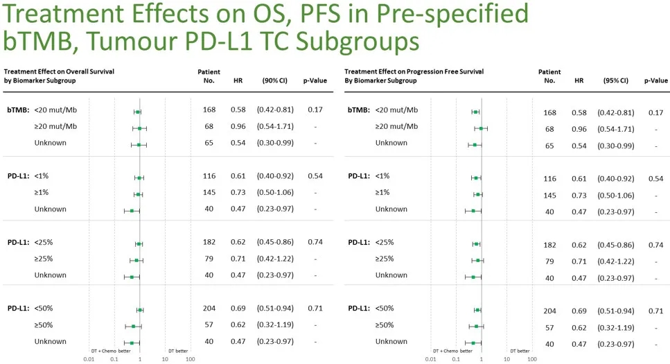 预先设定的亚组分析显示,无论血浆TMB (<20 vs.≥20 mut/Mb)、年龄、性别和吸烟状态如何,两组间均无明显差异。在本研究中PD-L1 TC水平与加用化疗后的获益无关。两组中,血浆TMB<20 mut/Mb患者的OS和PFS相比TMB≥20 mut/Mb患者更短。