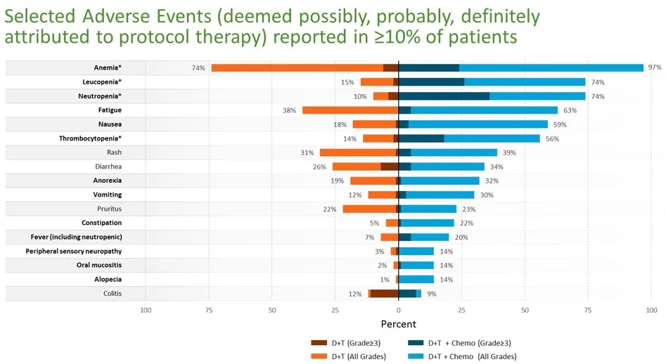 DT+CT组毒性大于DT组,3级或3级以上不良反应(AE)发生率为82% vs. 70%(p=0.02),最常见的AE是呼吸困难、恶心和咳嗽。免疫相关AE发生率相似。