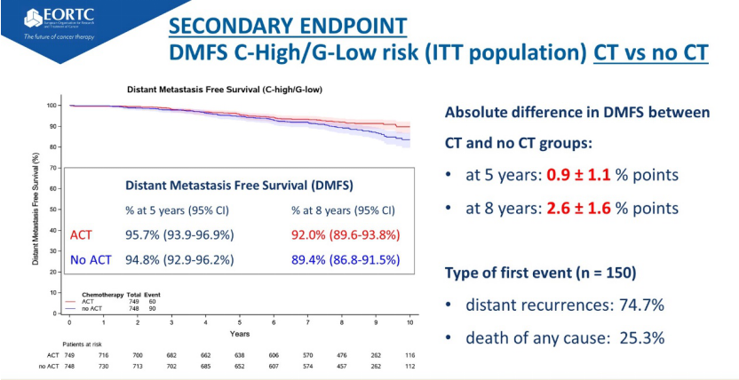 对于次要终点,在C-High/G-Low组中,化疗组较不化疗组的5年DMFS获益增加约1.5%(95.9% vs 94.4%,校正后HR=0.78,95% CI 0.50-1.21,P=0.27)。