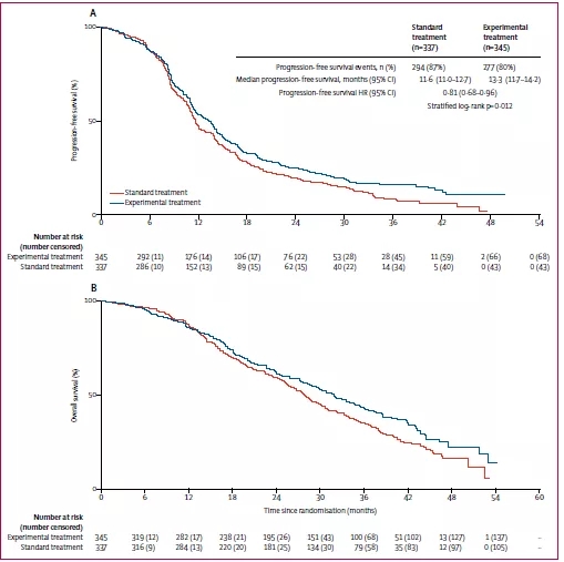 截止2018年6月10日,共有571例患者记录了PFS数据(标准组294例,试验组277例),标准组PFS中位随访时间11.3个月(IQR 8.0~18.4),试验组为12.4个月(8.3~21.7)。标准组中位PFS为11.6个月(11.0~12.7),试验组为13.3个月(11.7~14.2)(HR=0.81,95%CI: 0.68~0.96,P=0.012)。