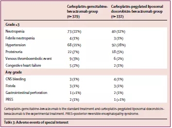 试验组345例:卡铂(AUC=5,第1天)+脂质体阿霉素(30 mg/m2,第1天)+贝伐珠单抗(10 mg/kg,第1天、15天),4周一个周期,共6个周期,后续单药贝伐珠单抗15 mg/kg,每3周一次维持治疗直到疾病进展或不可耐受毒副作用而中止治疗;