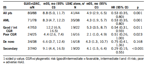 该研究表明,较之于单用LDAC,Glasdegib+LDAC可显著改善新诊断AML或高危MDS患者的总体生存(OS),并且对于不同细胞遗传学危险分层的患者均是如此,安全性也是可靠的。