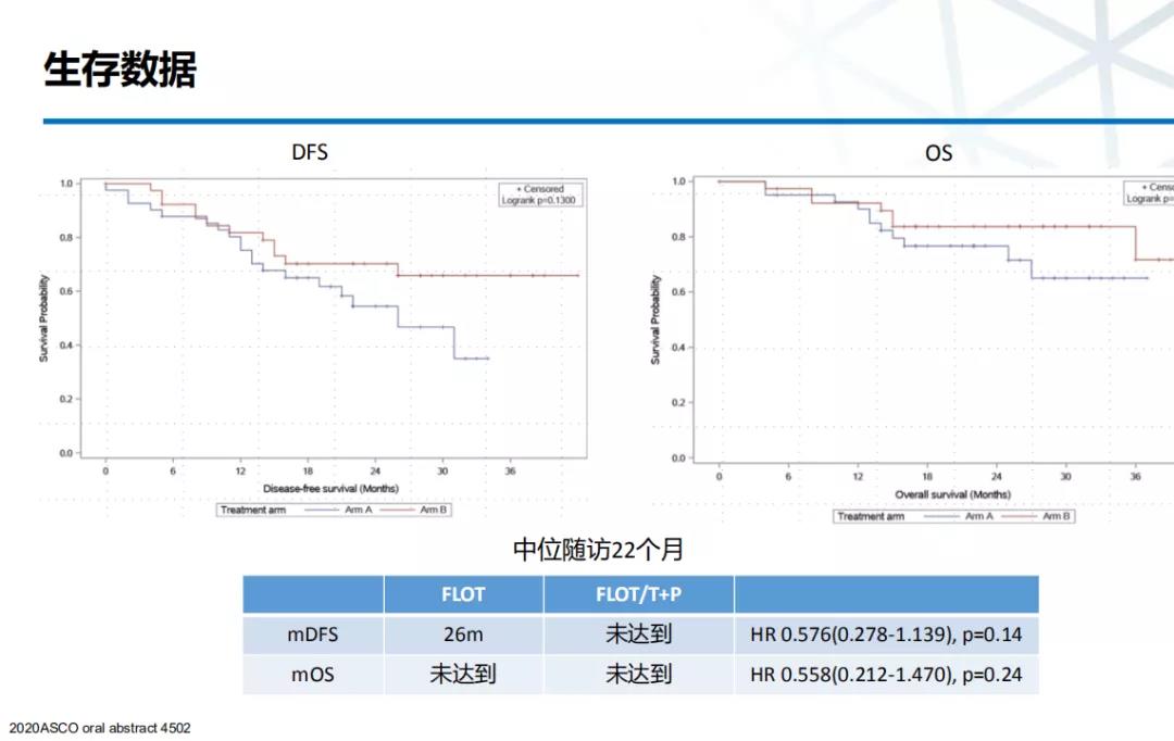 PETRARCA研究设计思路与FLOT系列研究类似,继续探索HER2阳性胃癌围术期FLOT方案联合曲帕双靶的疗效。本次主要公布了其Ⅱ期研究结果,研究纳入81例患者,随机分为A、B组,A组予以手术前后各4周期FLOT方案;B组予以手术前后各4周期FLOT+PH双靶方案,再序贯9周期PH双靶方案。结果显示添加PH双靶可以提高pCR率(B组 vs A组= 35% vs 12%)近3倍,并且延长了患者OS率(24个月OS率 B组 vs A组=84% vs 77%)和mDFS(B组vs A组=未达到 vs 26个月 HR=0.58,p=0.14),安全性上增加双靶后腹泻和白细胞减少有所提高,需要引起临床注意。但由于JACOB研究中PH双靶与单靶OS对比中生存获益明显但p值以0.057未能获得统计学差异,罗氏公司因此终止了双靶的探索。于是PETRARCA研究提前结束并不再开展Ⅲ期研究,从而给我们留下了难以看到最终OS差异的遗憾。我个人非常认可PETRARCA研究在迅速缩瘤的价值,以及DFS的延长(HR=0.58,p=0.14),为局部进展期HER2阳性胃癌术前使用抗HER2治疗提供了一定的证据。由于HER2阳性是局部进展期胃癌不良预后的生物标志物,而根治术后辅助抗HER2治疗尚无依据,现有临床实践中抗HER2的围手术期合理安排值得深入思考。