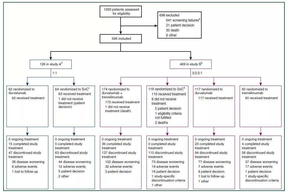 这是一项III期、随机、开放标签、多中心临床研究,旨在探索继往多线治疗的晚期NSCLC患者接受免疫治疗的疗效及安全性。本研究分为两部分:A部分旨在评估在PD-L1表达≥25%的患者, Durvalumab和标准治疗的疗效及安全性;队列B旨在比较PD-L1表达<25%的患者,PD-L1单克隆抗体Durvalumab联合CTLA-4抑制剂——Tremelimumab和标准治疗、Durvalumab单药和Tremelimumab单药的疗效及安全性。