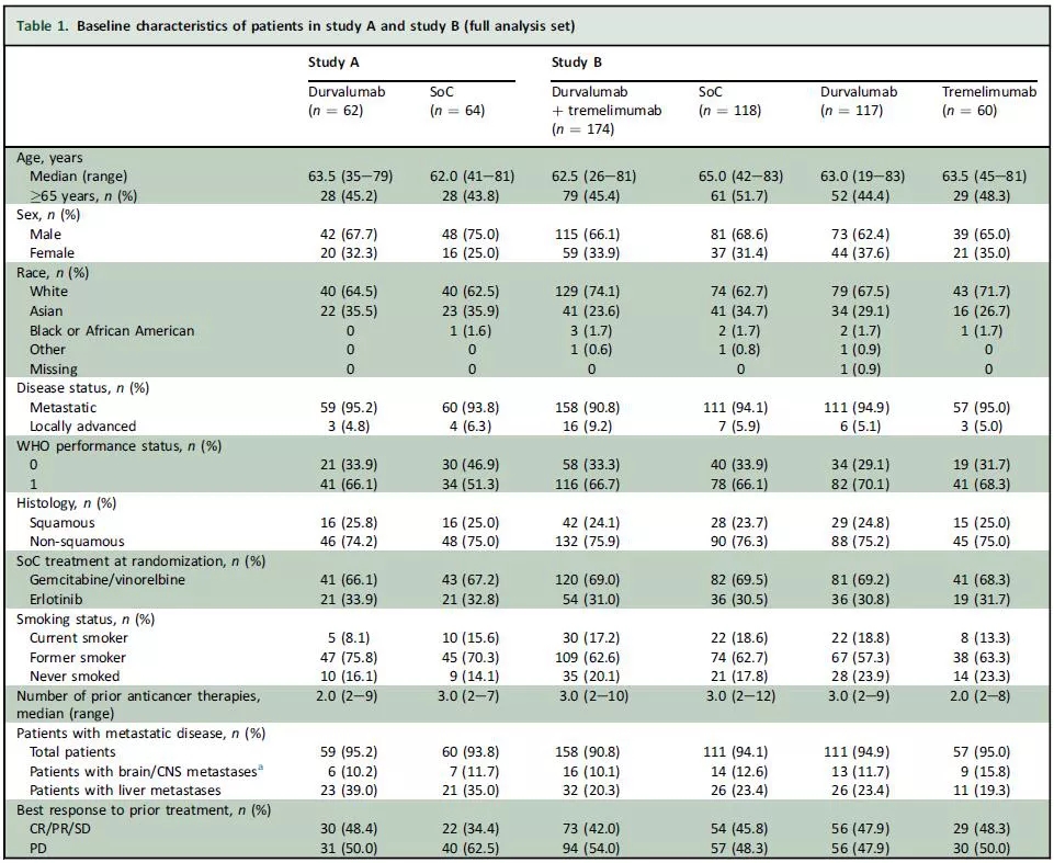 其中,A部分患者中,分别有48.4%和56.3%的患者疾病进展后接受进一步治疗,分别有8.1%和42.2%的患者接受后线免疫治疗,两组患者基线特点均衡可比;B部分双免疫治疗组、标准治疗组、Durvalumab单药和Tremelimumab单药分别入组174例、118例、117例和60例患者。疾病进展后分别有34.5%、43.2%、42.7%和35%的患者接受后续治疗,其中分别有5.2%、27.1%、11.1%和13.3%的患者接受后续免疫治疗。四组之间基线特点均衡可比(图2)。
