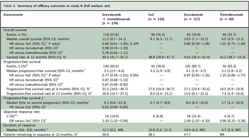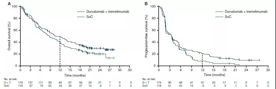 研究的主要研究终点为A部分的PFS和OS;B部分为双免疫和标准治疗比较的PFS和OS,关键次要终点为四组12个月的OS率,6个月和12个月的PFS率,其他次要重点包括ORR、反应持续时间等。