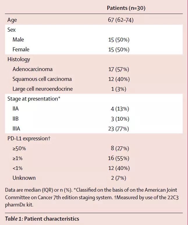 这是一项研究者发起的开放标签、多中心、单臂、II期临床研究,患者入组标准为:年龄≥18周岁;基于第7版TNM分期为Ib-IIIa期病理确诊且潜在可手术切除患者的NSCLC患者,患者PS评分0-1分;不吸烟者(基于KeyNote-001研究结果,吸烟或既往吸烟者总体ORR为22.5%,而不吸烟患者总体ORR仅为10.3%)、自身免疫系统疾病者、患有间质性肺疾病患者或过去5年内有恶性肿瘤病史、正在接受免疫抑制剂治疗的患者不允许入组。患者入组前并不强制进行纵膈淋巴结检查以确定 N分期,但是需要进行PD-L1检查(基于22C3抗体进行)。符合入组标准的患者,在每周期第1天接受阿特珠单抗1200 mg联合卡铂(AUC=5)及白蛋白结合型紫杉醇(100mg/m2,每周期第1天、第8天、第15天给药)。化疗药物为白蛋白结合紫杉醇的主要原因是为了避免糖皮质激素的使用。