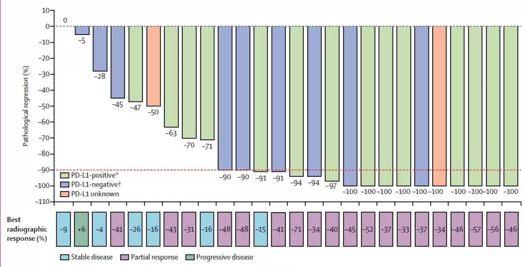 疗效:该研究中,主要病理学缓解率为57%,其中33%的患者出现完全病理学缓解,接受R0切除的患者,瘤体中位退缩程度达到92.5%。以50%作为截断值,未发现PD-L1表达水平和MPR之间存在相关性(P=0.67),但基于RECIST的影像学反应和MPR之间存在相关性(P=0.0022)(图2)。
