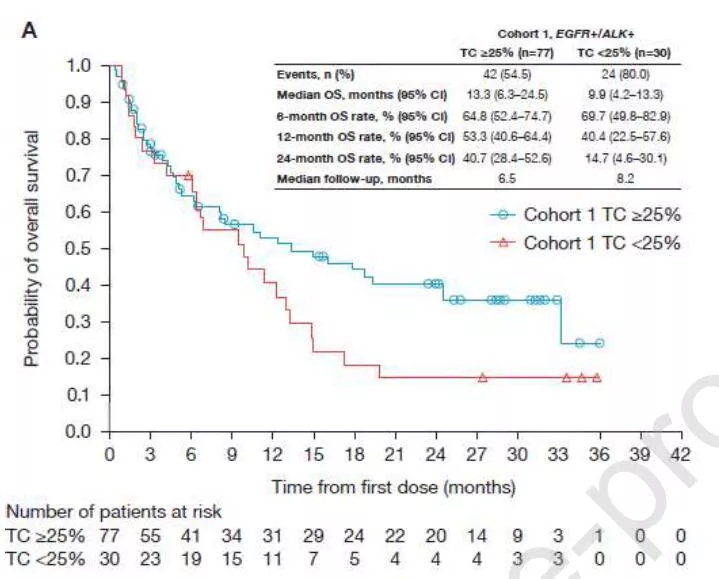 在队列1中,高表达和低表达患者的OS分别为13.3个月和9.9个月。高表达和低表达患者,6个月OS率分别为64.8%和69.7%,12个月OS率分别为53.3%和40.4%,24个月OS率分别为40.7%和14.7%(图1)。队列1的亚组分析显示,携带EGFR基因突变的患者,OS为16.1个月,在数值上优于ALK突变组的6.3个月。