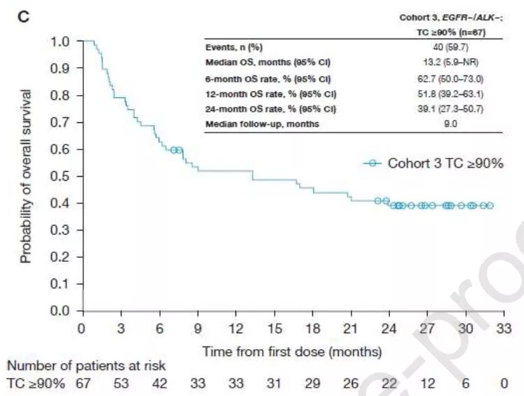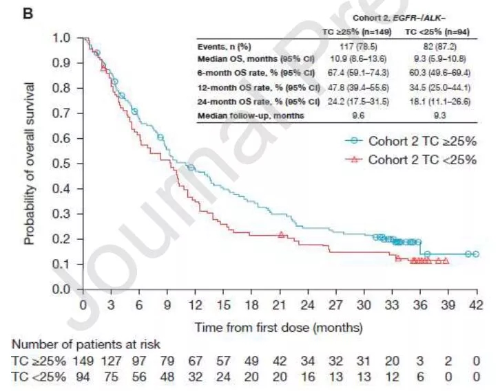 三个队列中,PD-L1表达水平较高的患者,中位OS在数值上更好,12个月和24个月的OS率同样在PD-L1高表达患者中更优。具体为: