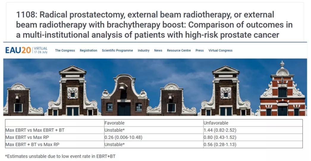 2020 EAU会议的abs 1108(图1)报道了三种MAX治疗方式在高危特征前列腺癌的疗效。MAX治疗包括“根治性前列腺切除术联合术后辅助放疗”、“ 外照射治疗联合2年以上ADT”和“外照射联合近距离照射再联合1年以上ADT”三种方案。何种治疗方式最优一直是困扰临床的难题。abs 1108是一个前瞻性队列研究,入组9775例高危前列腺癌患者,7751例患者纳入分析,结果在平均随访6.1年的前提下,发现三种MAX治疗方式的前列腺特异性死亡(PCSM)无显著性差异。提示对于局部高危前列腺癌患者,三种治疗方式疗效相当,为局部晚期的前列腺癌患者治疗方案提供了选择依据。