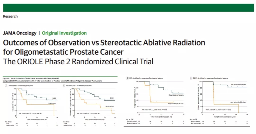 同时,我们也有一些数据认为对于寡转移的患者进行转移灶的放疗,也可能改善预后。例如ORIOLE(图3)和STOMP研究,但目前的相关研究均为小样本、前瞻性Ⅱ期临床试验,其研究终点多为PFS、DFS等OS的替代终点,而OS临床终点生存获益尚未得到证实。因此,针对转移灶放疗的生存获益尚存争议。我们预期部分患者可能从这种治疗中获益,但需要进一步根据基因组学、病理学和影像学特征,对潜在获益人群进行筛选。