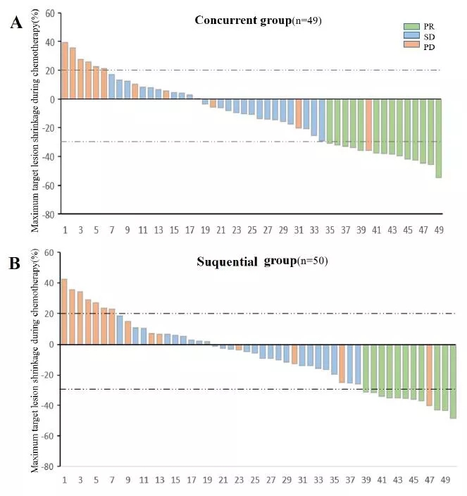 同步化疗组和续贯化疗组的ORR分别为28.6%和22.0%,差异无统计学意义(P=0.45),DCR分别为77.6%和72.0%,差异同样无统计学意义(P=0.53)(图5)。