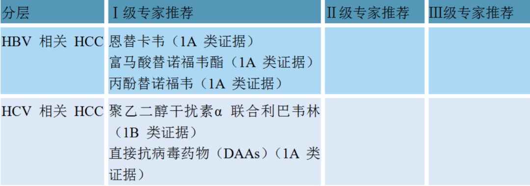 1、HBV 相关 HCC:Ⅰ级专家推荐删除“恩替卡韦、替诺福韦酯(1A 类证据)”,替换为“恩替卡韦(1A 类);富马酸替诺福韦酯(1A 类证据);丙酚替诺福韦(1A 类证据)”。删除Ⅱ级专家推荐“替比夫定(1B 类证据)”。删除Ⅲ级专家推荐“阿德福韦酯、拉米夫定(1B 类证据)”。