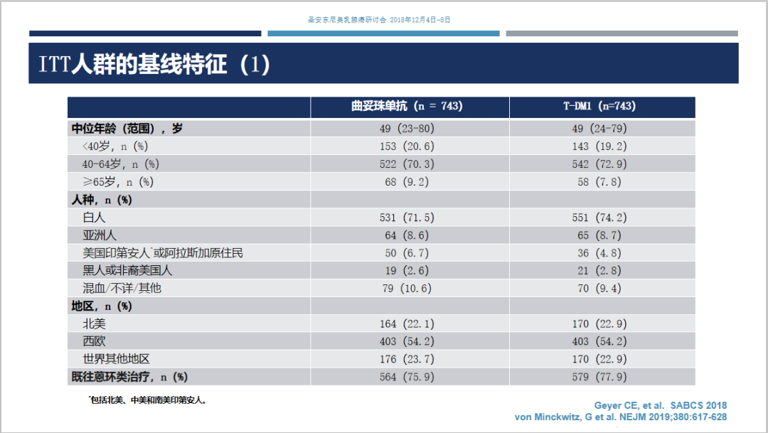研究设计:研究入组患者为cT1-4/N0-3/M0、经新辅助治疗后仍然有残留病灶的HER2阳性乳腺癌患者,新辅助化疗要求至少6个周期(不少于9w的紫杉醇,允许使用蒽环和烷化剂,化疗均在术前完成),新辅助靶向治疗要求至少曲妥珠单抗9w(允许双靶)。患者术后12w随机分配至T-DM1组(3.6 mg/kg IV Q3W,共14周期)和曲妥珠单抗组(6 mg/kg IV Q3W,共14周期),主要终点为iDFS(预设的最终目标为3年iDFS率从曲妥珠单抗组的70.0%提高至T-DM1组的76.5%,HR 0.75)。研究于2013年4月3日至2015年12月31日共入组了1486例患者(曲妥珠单抗组和T-DM1各743例)。