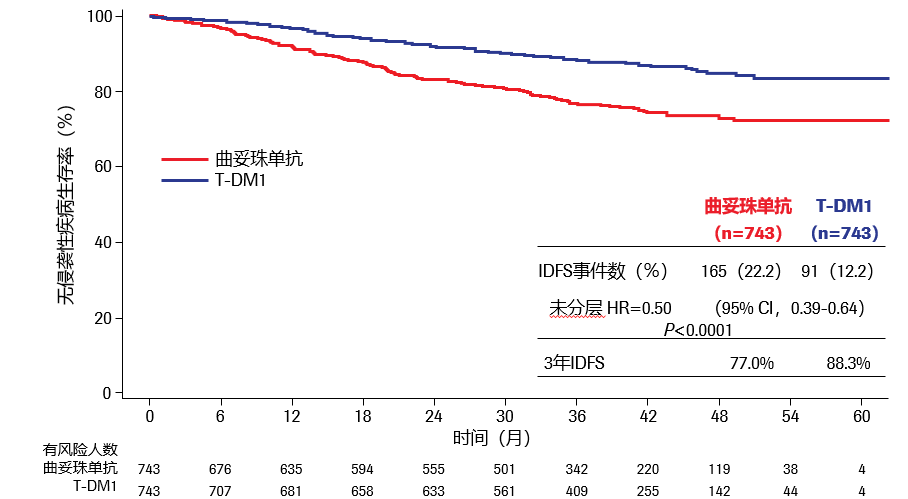 研究结果:2018年SABCS大会上报道了中位随访41个月的初次分析显示,相较于曲妥珠单抗组,T-DM1组患者的3年DFS率显著提高了11.3%(77.0% vs 88.3%,HR0.50,95% CI 0.39~0.64),乳腺癌侵袭性复发风险或死亡的降低了50%。