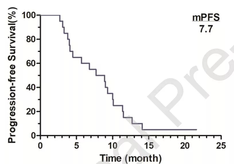 从2018年4月至2019年1月,共计20例患者入组。患者基线临床病理特点如下:男性65%,吸烟者55%,PS评分0分65%,90%的患者基线有远处转移,70%的患者基线有脑转移,分别有5例和4例患者携带EGFR第19缺失和21L858R突变,2例患者携带其他非经典突变;5例患者携带KRAS突变,1例患者携带BRAF突变,1例患者携带HER-2第20外显子插入突变,另有2例为野生型患者。患者中位治疗周期数为6周期,14例患者接受阿帕替尼的维持治疗。