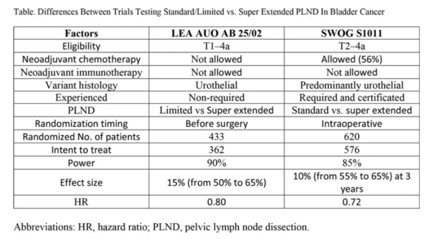 既往有对扩大淋巴结清扫术和标准PLND术比较的meta分析,但最终这项meta分析仅列入了LEA AUO AB 25/02研究的结果,因为这是唯一一个可用的临床试验,尽管当时支持超扩大PLND清扫的观点盛行,但该研究结果还是受到例如研究的样本量有限之类的不确定因素的影响,且结果缺乏统计学意义。该研究的作者最终得出结论:与标准PLND术相比,超扩大PLND术可以降低任何原因导致的死亡风险,以及膀胱癌相关的死亡风险,但置信区间包括无效的可能性。他们还认为,基于后续长达30天的随访,由于研究的局限性和不严密性,与标准的PLND相比,超扩大PLND是否会导致更多的3级或更高的不良反应还存在不确定性。