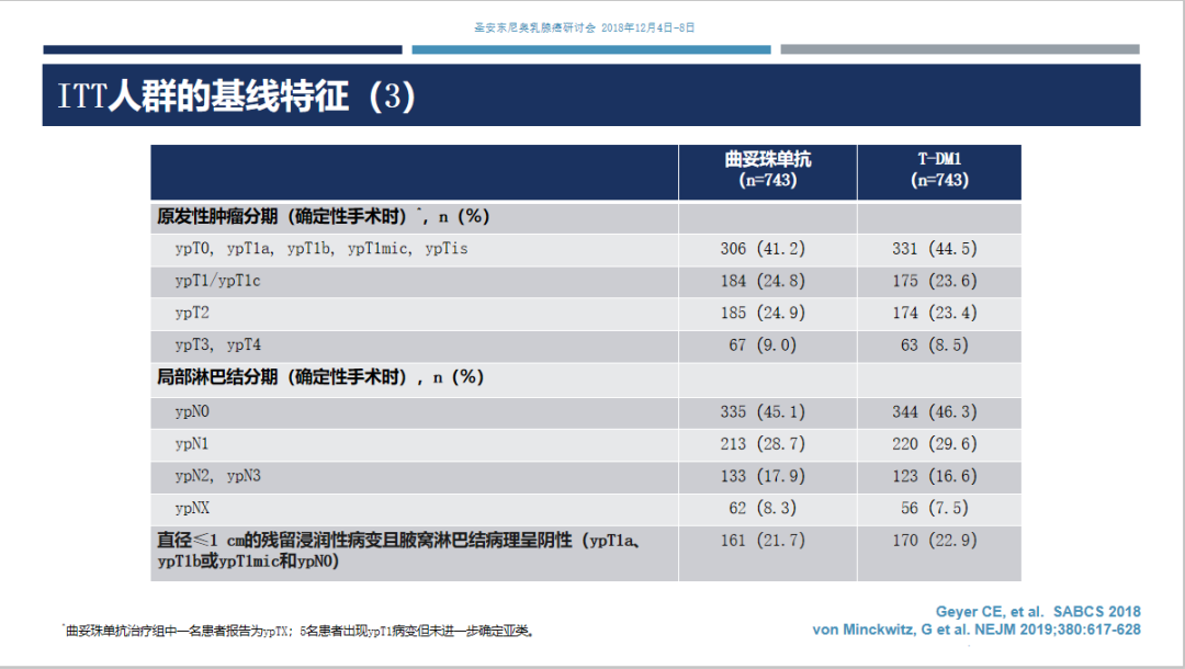 研究设计:研究入组患者为cT1-4/N0-3/M0、经新辅助治疗后仍然有残留病灶的HER2阳性乳腺癌患者,新辅助化疗要求至少6个周期(不少于9w的紫杉醇,允许使用蒽环和烷化剂,化疗均在术前完成),新辅助靶向治疗要求至少曲妥珠单抗9w(允许双靶)。患者术后12w随机分配至T-DM1组(3.6 mg/kg IV Q3W,共14周期)和曲妥珠单抗组(6 mg/kg IV Q3W,共14周期),主要终点为iDFS(预设的最终目标为3年iDFS率从曲妥珠单抗组的70.0%提高至T-DM1组的76.5%,HR 0.75)。研究于2013年4月3日至2015年12月31日共入组了1486例患者(曲妥珠单抗组和T-DM1各743例)。