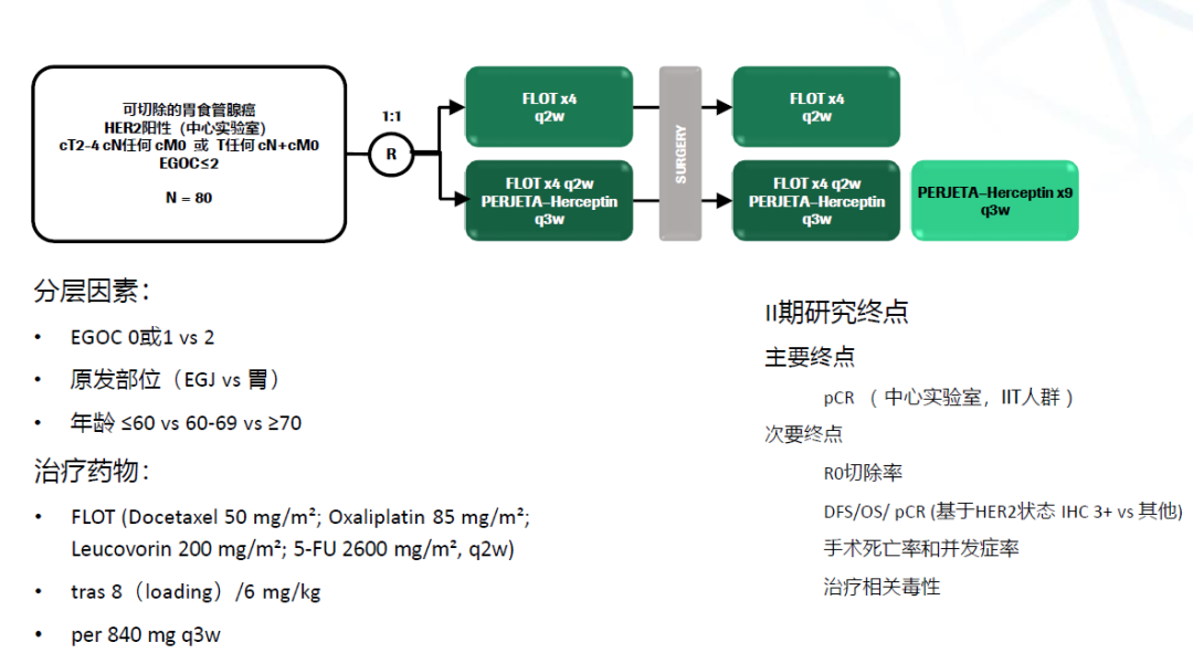 研究背景:在欧美人群围术期FLOT方案是可切除的食管胃腺癌(EGA)的标准疗法。本试验旨在研究曲妥珠单抗和帕妥珠单抗联合FLOT方案在HER2阳性可切除的食管胃腺癌患者中的治疗效果。