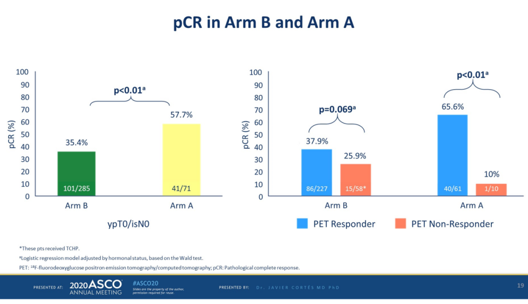 王廷教授:我个人对pCR与患者的DFS、OS的相关性持保留态度,比如NeoALTTO研究提示pCR与患者的远期生存并不是完全一致的。因此,如果患者达到pCR,我仍然会延续之前新辅助治疗使用的双靶治疗方案。