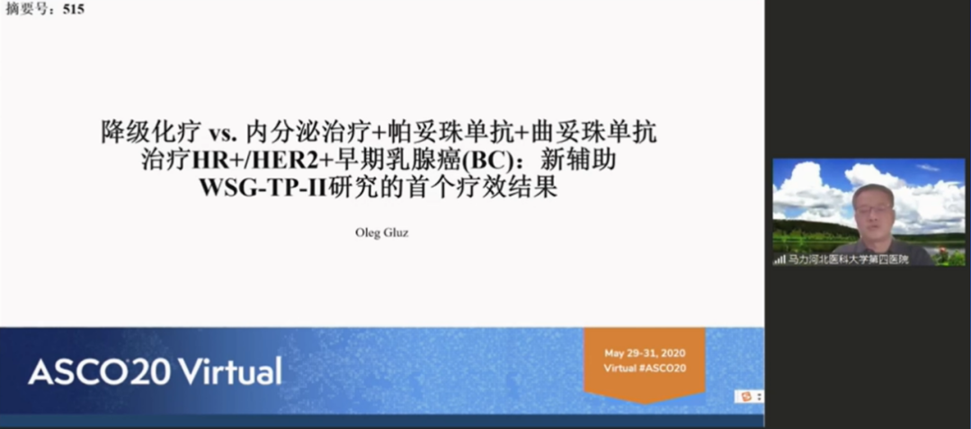 河北医科大学第四医院的马力教授分享了2020ASCO新辅助进展相关内容。从三种分子分型出发着重介绍了ASCO最新报道的TRAIN-2、WSG-TP-II和FELINE研究。纵观三项临床研究,不难看出其共同特点都是试图对化疗做降阶选择,TRAIN-2研究的3年随访结果提示在II期和III期HER2阳性乳腺癌患者中含蒽环类方案并未使EFS和OS受益;WSG-TP-II研究是首个HR+/HER2+早期乳腺癌的减化疗的新辅助随机对照研究;而FELINE研究则是在新辅助平台中试图找到一部分对新型内分泌治疗(AI+CDK4/6i)及其敏感的人群。随着靶向治疗与内分泌治疗方法百花齐放、日趋成熟,化疗的权重似乎将越来越低。