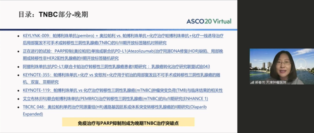 天津医科大学肿瘤医院郝春芳教授对2020ASCO TNBC治疗进展进行了精彩的梳理。郝春芳教授认为对于早期TNBC乳腺癌近年的研究重点主要集中在辅助治疗的化疗/免疫治疗的强化、新辅助后残余肿瘤的化疗/免疫治疗的强化以及新辅助治疗的细化分型的精准化探索方面。其中着重介绍了SYSUCC-001研究,该研究的结论为可手术的TNBC患者卡培他滨节拍化疗维持治疗DFS显著改善且耐受性良好,未观察到非预期的严重不良事件。在晚期TNBC中郝春芳教授介绍了KEYNOTE355研究和KEYNOTE119研究的最新研究结果,概括了免疫治疗的发展历程。