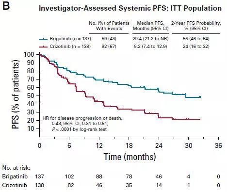 数据分析时(即2019年7月28日),布格替尼组和克唑替尼组分别有55%和17%的患者仍然接受治疗。中位随访时间分别为24.9个月和15.2个月,中位治疗持续时间分别为24.8个月和8.4个月。