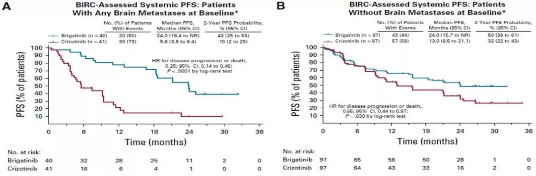 颅内ORR和PFS:布格替尼组和克唑替尼组分别有40例和41例患者基线存在脑转移。独立评审委员会评估的有脑转移患者,其全身PFS分别为24个月和5.6个月,两年PFS率分别为43%和10%;无脑转移的患者,两组PFS分别为24个月和13个月,两年PFS率分别为50%和32%(图5)。