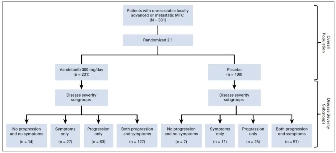 在德国马格德堡大学医院临床研究员Michael C. Kreissl医学博士及其同事开展的评估凡德他尼有效性和安全性的国际、Ⅲ期、随机临床研究——ZETA试验中,纳入331例不可切除的局部晚期或转移性MTC患者,将患者随机分配给予口服凡德他尼(初始剂量300 mg/d,n=231)或安慰剂,持续治疗直至病情恶化。