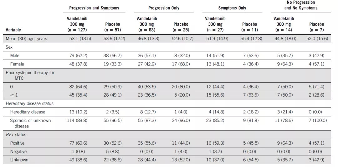 图2. ZETA试验中MTC 患者中4个亚组的基线特征
