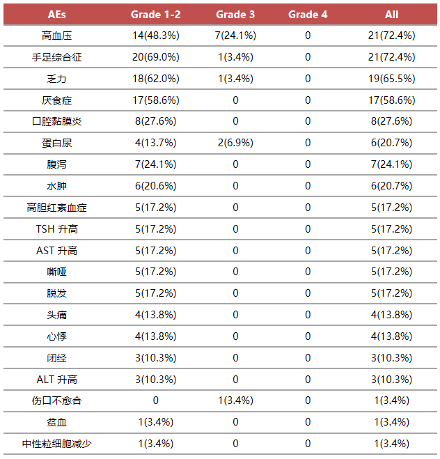 在安全性方面,这项研究中阿帕替尼的安全性良好,3级不良事件(AEs)发生率为37.9%,低于既往文献报道的其他靶向治疗,并且未发生4级AEs。在生活质量方面,疼痛评分显示,大多数患者经过6个月的治疗后疼痛得到了显著缓解。