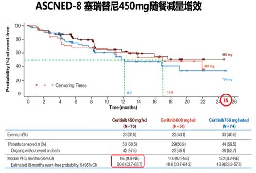 研究结果显示,450mg随餐服用和750mg空腹的稳态血药浓度相当,同时塞瑞替尼450mg随餐服用减少了药物对胃肠道局部刺激、安全性更好、耐受性更高,大大提高了治疗依从性,疗效较750mg空腹剂量增加的趋势, ORR为78.1%vs75.7%, PFS从12.2个月提高到随访超过25个月但中位PFS仍未到达。