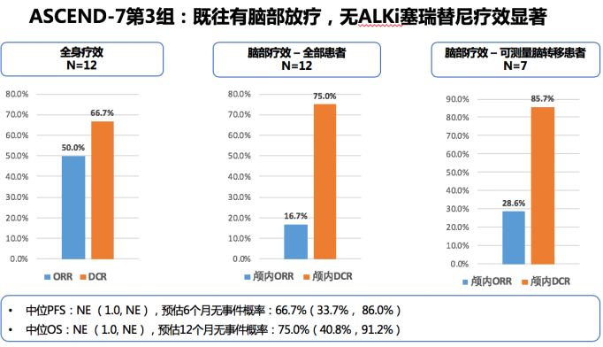ASCEND-7研究第3组分析结果显示,既往有脑部放疗但放疗未能控制住,无ALK抑制剂治疗史的患者经塞瑞替尼治疗后,全身疗效ORR可达50%,颅内ORR为16.7%,可测量脑转移患者的颅内ORR为28.6%。无论是全身、颅内或可测量脑转移的颅内DCR均能达到70%左右,其中可测量脑转移颅内DCR甚至可达85.7%,中位PFS 未达到,预估6个月无事件概率66.7%,中位OS未达到,预估12个月无事件概率75.0%。
