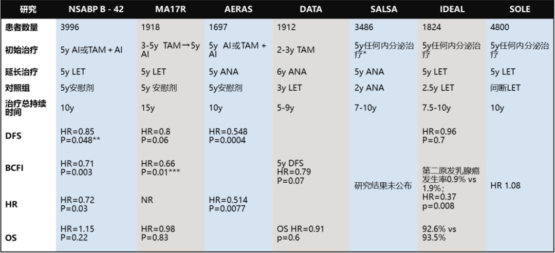 随后开启绝经后辅助内分泌治疗延长研究,诸如在NSABP-B425、MA.17R6、AERAS研究中探讨5年内分泌治疗之后延长5年AI对比安慰剂的疗效,以及在DATA7、ABCSG-168、IDEAL9、SOLE研究中探讨5年内分泌治疗后延长5-6年AI对比2-3年AI的疗效。遗憾的是没有看到延长应用5-6年AI与2-3年AI之间差别,然而这些短疗程与长疗程延长研究的缺点是没有安慰剂对照,因此不能说明AI延长的最佳获益时长。