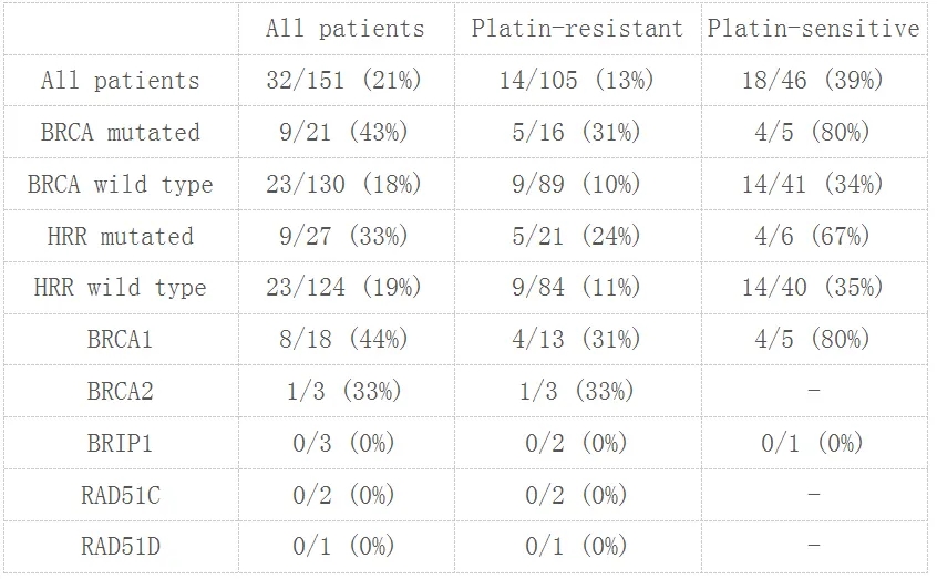 研究结论:在铂敏感卵巢癌、铂耐药卵巢癌及无HRR基因突变的患者中,奥拉帕利单药治疗显示出令人鼓舞的有效性。