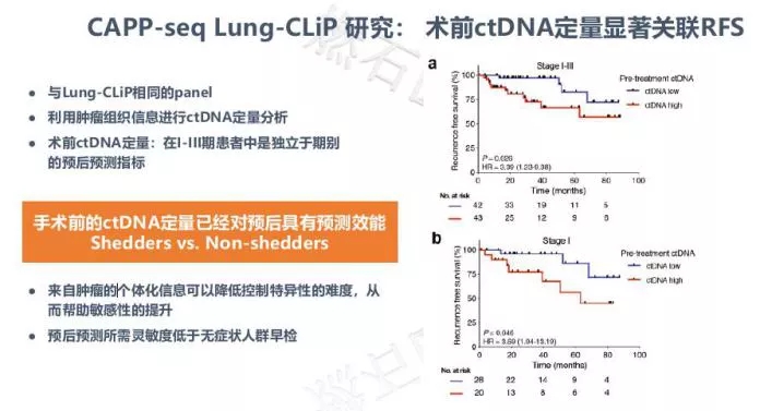 CAPP-Seq (癌症个体化深度测序) Lung-Clip是一项通过分析血液中的DNA突变,鉴别出早期肺癌患者的研究,其测序深度20000X(unique depth 5000X),在98%特异性下,I/II/III期敏感性仅为41%/54%/67%。它的瓶颈来自于过小的肿瘤,血浆中ctDNA含量低于技术的检测极限。而ctDNA检测用于局部肺癌患者MRD研究展现极强的预后预测效能:该项研究中37例患者治疗后多个随访节点检测ctDNA,20例患者至少在一个随访节点中ctDNA检测阳性,这部分患者均复发。