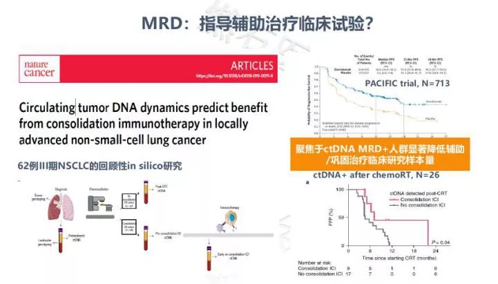 MRD是否可指导辅助治疗临床试验呢?一项纳入了62例III期NSCLC的回顾性研究里,聚焦于ctDNA MRD+人群,显著降低辅助/巩固治疗临床研究样本量——只需要26位患者就可以看到统计学显著差异,而在PACIFIC里面要呈现这样显著的结果,最终是纳入了700多例的患者。