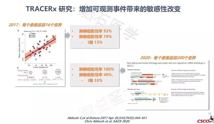 TRACERx 研究给了我们增加可观测事件可提高敏感性的直观证据。对于肺癌患者,当每个患者追踪变异数从16个增加至200个时,肺鳞癌阳性率可从93%提升至100%,肺腺癌阳性率可从19%增加至49%,整体I期阳性率从13%提升至33%。