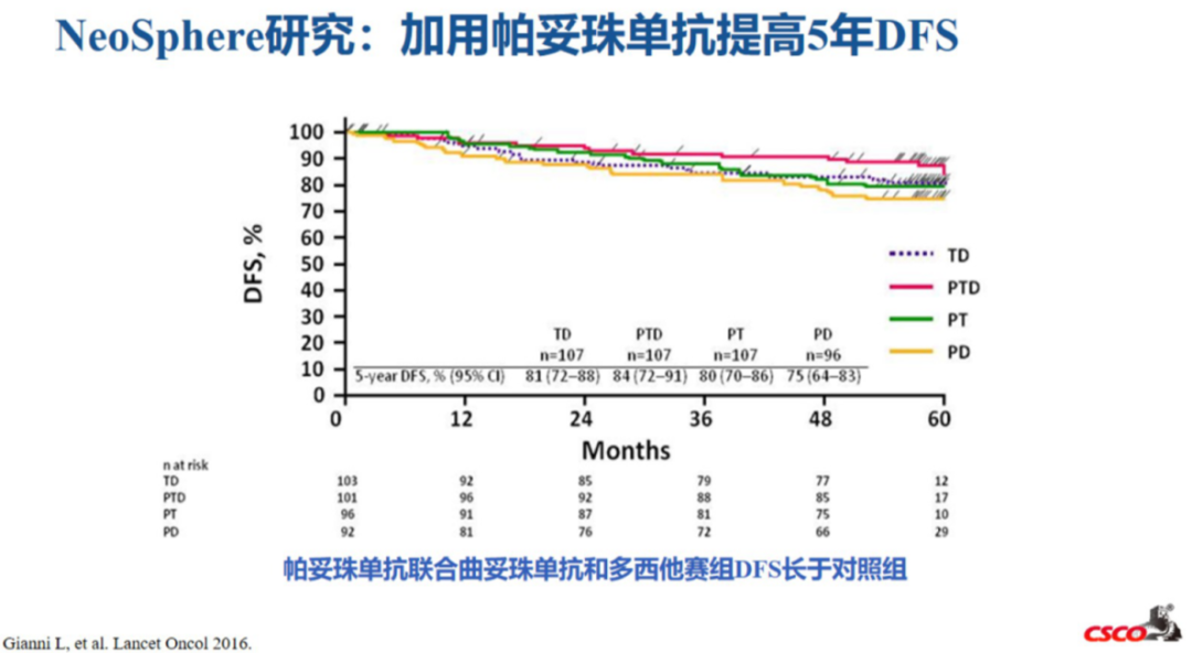 NeoSphere研究共纳入417例局部晚期非炎性或早期HER2阳性乳腺癌患者,评价四周期曲妥珠单抗+多西他赛、帕妥珠单抗+曲妥珠单抗+多西他赛、帕妥珠单抗+曲妥珠单抗、帕妥珠单抗+多西他赛新辅助治疗后手术,术后辅助化疗的疗效。2012年,该研究结果显示,帕妥珠单抗+曲妥珠单抗+多西他赛与曲妥珠单抗+多西他赛相比,能显著提高患者的bpCR率(45.8% vs 29%,P=0.0141)。2016年,5年的数据分析显示,帕妥珠单抗+曲妥珠单抗+多西他赛组与曲妥珠单抗+多西他赛组相比,5年DFS率分别为86% vs 81%,(HR=0.69;95%CI:0.34~1.40),可见无论是pCR还是DFS,联合双靶新辅助治疗都能使患者显著获益。