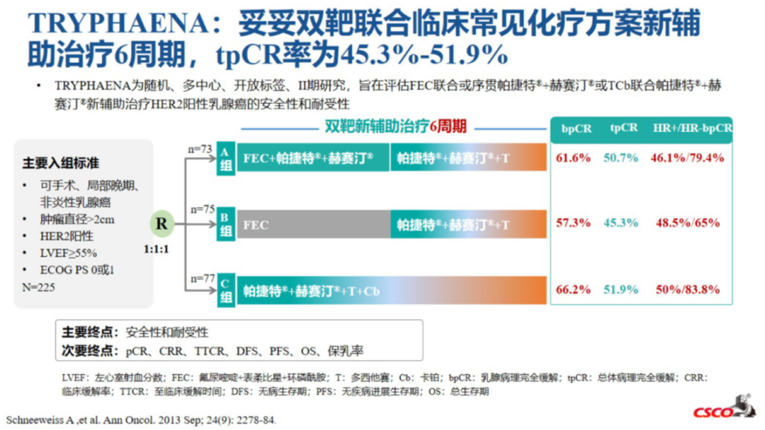 TRYPHAENA研究是一项随机多中心的Ⅱ期研究,目的在于比较新辅助治疗FEC同时或者序贯妥妥双靶的疗效、安全性和耐受性。该研究结果显示TCbHP(非蒽环组)和FEC-THP方案(蒽环/紫杉组)下的pCR相似,从而提示我们,新辅助化疗联合或同时序贯妥妥双靶患者疗效无显著差异,去蒽环方案可行。