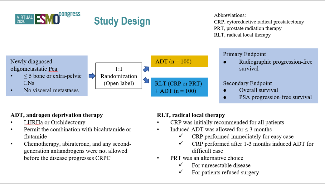 研究共入组200例患者,按1:1随机分配到单纯内分泌治疗组(ADT组)和内分泌治疗合并原发灶根治性治疗组(ADT+RLT组),分配到ADT+RLT组的患者将接受评估,对于手术难度较小的患者将行即刻原发灶根治范围的前列腺癌切除术,对于手术难度较大的患者行3个月的术前诱导内分泌治疗,对于内分泌治疗后仍无法手术的患者或不愿接受手术的患者则行原发灶放疗。研究的主要终点为无影像学进展时间(rPFS)。次要终点包括:总生存时间(OS)和PSA无进展生存时间(PSA-PFS)。