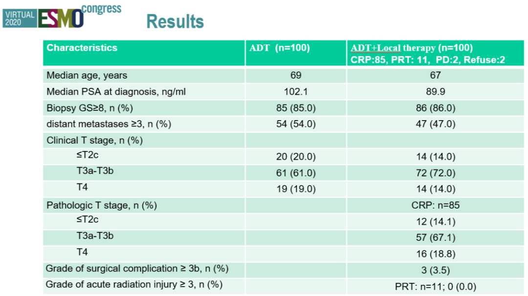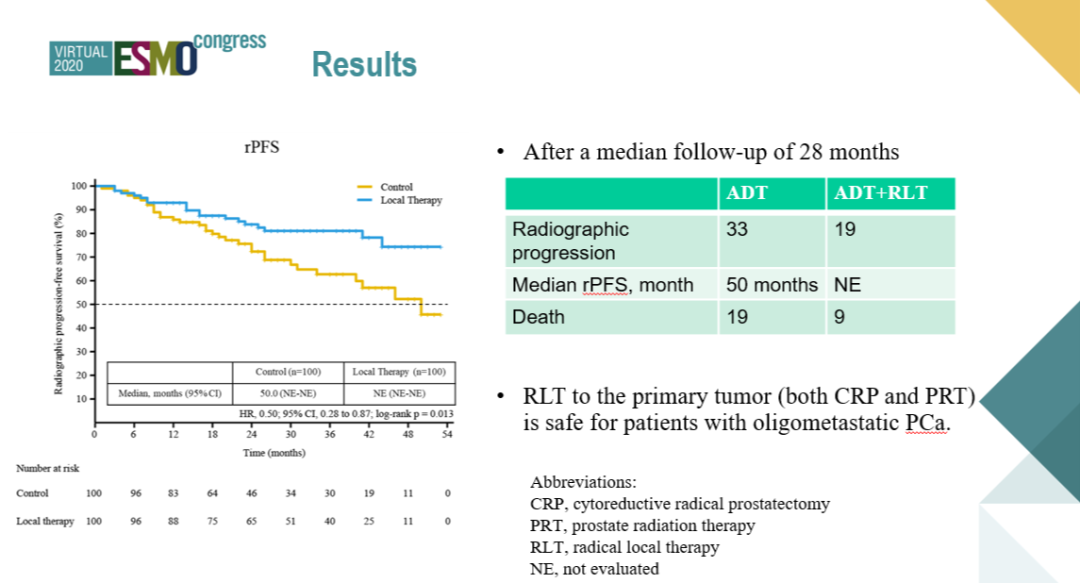 该研究于2019年3月完成全部患者入组,其中分配到ADT+RLT组的患者中有85人接受了前列腺根治术的治疗,11人接受了根治性放疗,4人未接受原发灶治疗。未接受原发灶治疗的4例患者中,有2例是因为拒绝接受原发灶的任何治疗措施,故未给与治疗,另有2例是因为在3个月的诱导内分泌治疗期间就发生了全身性的疾病进展,故未进一步行原发灶的治疗。