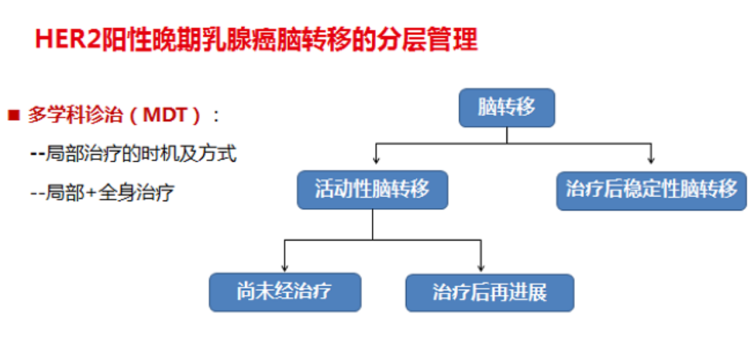研究显示HER2阳性乳腺癌脑转移发生率高于其它亚型乳腺癌,约为30%,治疗原则需多学科诊治(MDT),脑转移局部治疗与全身治疗相结合。既往脑转移分层管理为局部治疗手段为主,包括有限脑转移病灶数目、弥散脑转移病灶和脑膜转移。对于HER2阳性脑转移,在局部治疗的基础上,抗HER2靶向治疗药物也能发挥治疗作用。因此根据药物治疗的选择不同,可以分为:(1)活动性脑转移,包括尚未经过局部治疗的脑转移和局部治疗后再次出现疾病进展的脑转移。(2)局部治疗后稳定性脑转移,目前研究显示拉帕替尼+卡培他滨、吡咯替尼+卡培他滨、奈拉替尼+卡培他滨、曲妥珠单抗+图卡替尼+卡培他滨等治疗方案能在特定分层的脑转移中发挥作用。