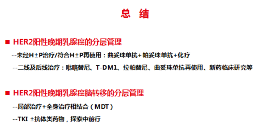 总之,HER2阳性晚期乳腺癌的治疗分层管理是关键,根据患者肿瘤情况,一般状态以及既往治疗情况,选择合适的治疗药物和手段,能够给患者带来更多的获益。
