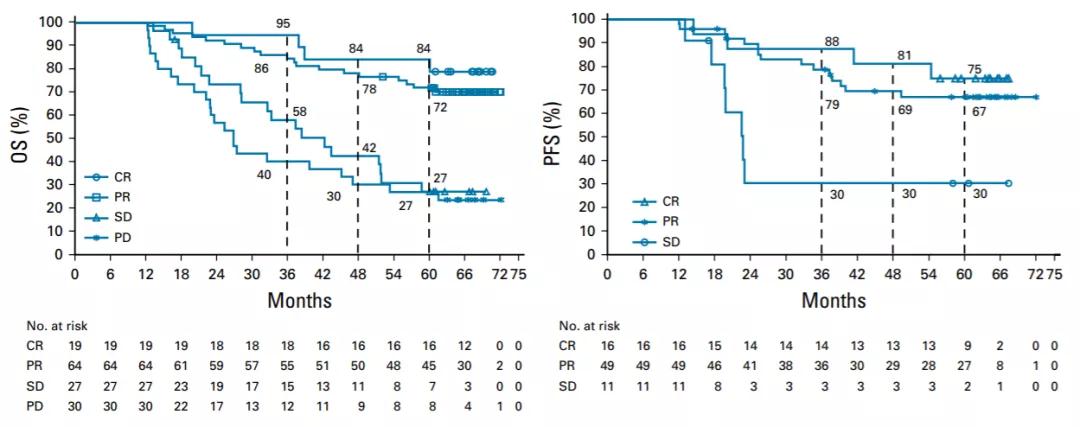 2019年2月发表于JAMA Oncol的文章报告了随访3年的数据显示,纳武利尤单抗组和达卡巴嗪组的3年OS率分别为51.2%和21.6%,3年PFS率分别为32.2%和2.9%。近日,发表于J Clin Oncol的文章报告了随访5年的数据。