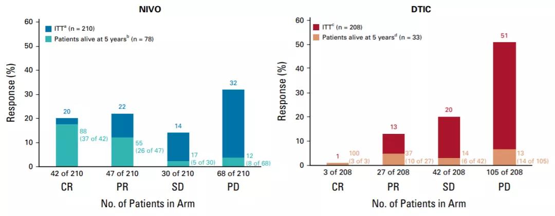 在随访5年的存活患者中,纳武利尤单抗组和达卡巴嗪组的ORR分别为81%(63/78)和39%(13/33)。在未接受后续系统治疗的5年存活患者中,纳武利尤单抗的ORR为92%(48/52),其中CR率为56%(29/52),而达卡巴嗪仅有2例患者(均为CR)5年存活且未接受后续治疗。